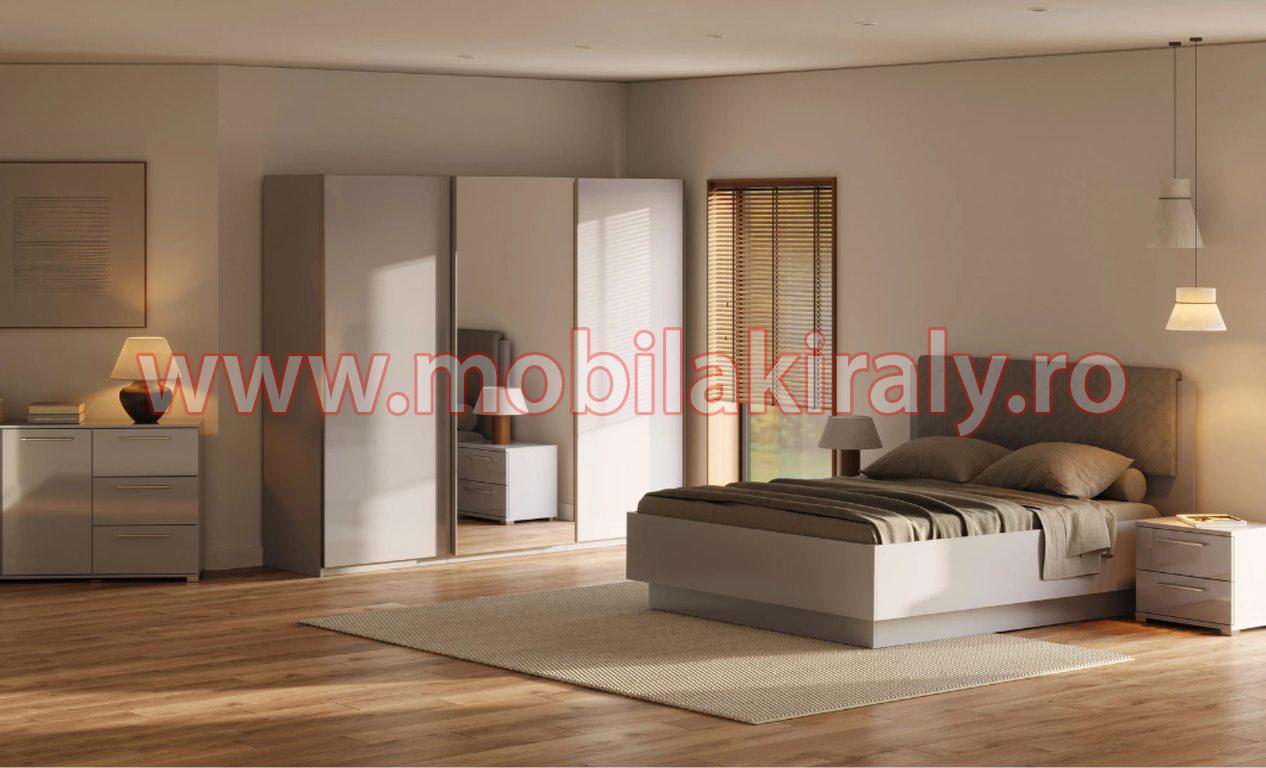 Comoda propusă pentru acest mobilier sparge tiparul undelor, fiind compusă din două uși și trei sertare, cu inserții pătrate de MDF melaminat lucios pe partea centrală, ce închid perfect tabloul vizual al mobilierului. Toate piesele sunt cantuite cu canturi ABS.