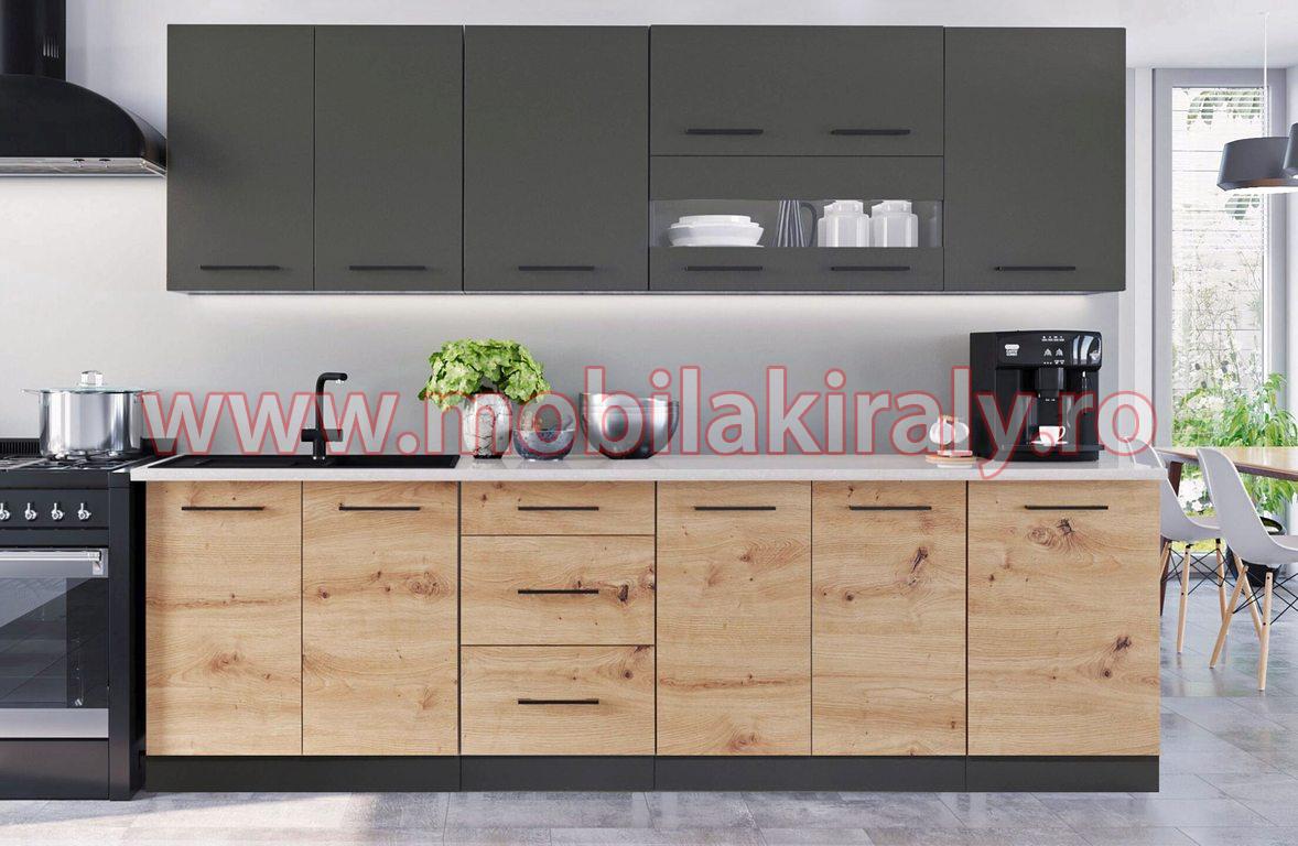 Mobila de bucatarie realizata din PAL melaminat 18 mm, cant ABS, blat termorezistent 38 mm, picioare metalice.