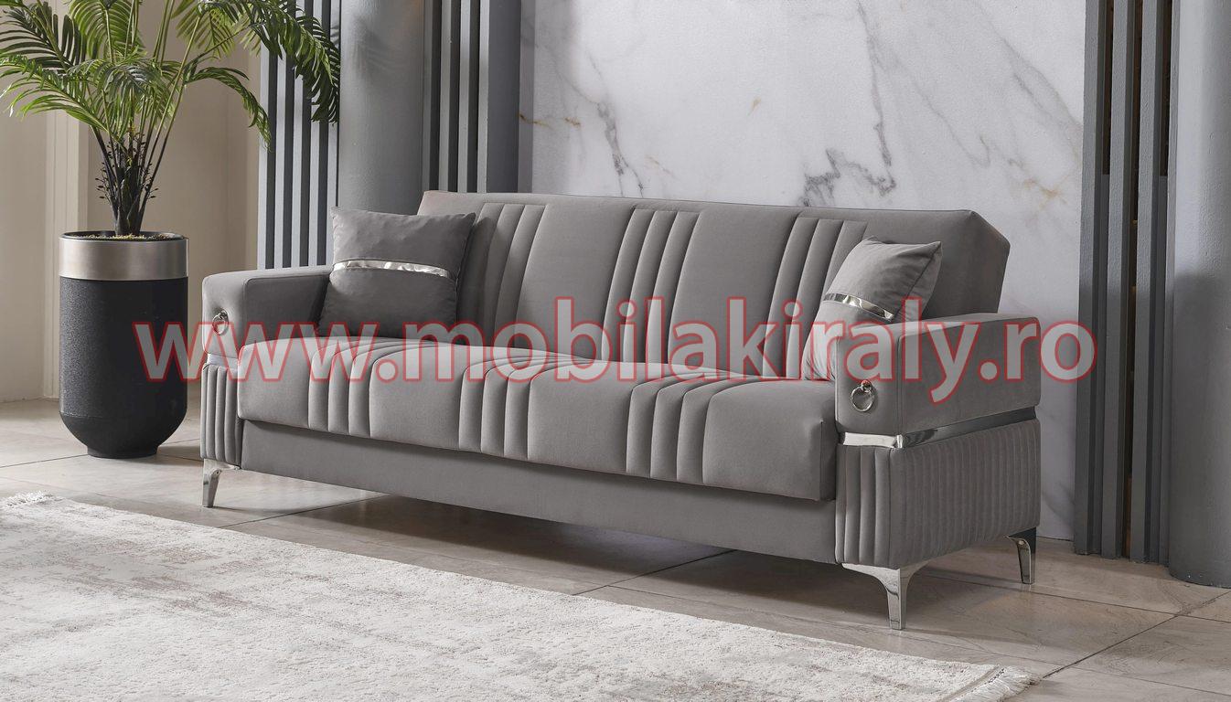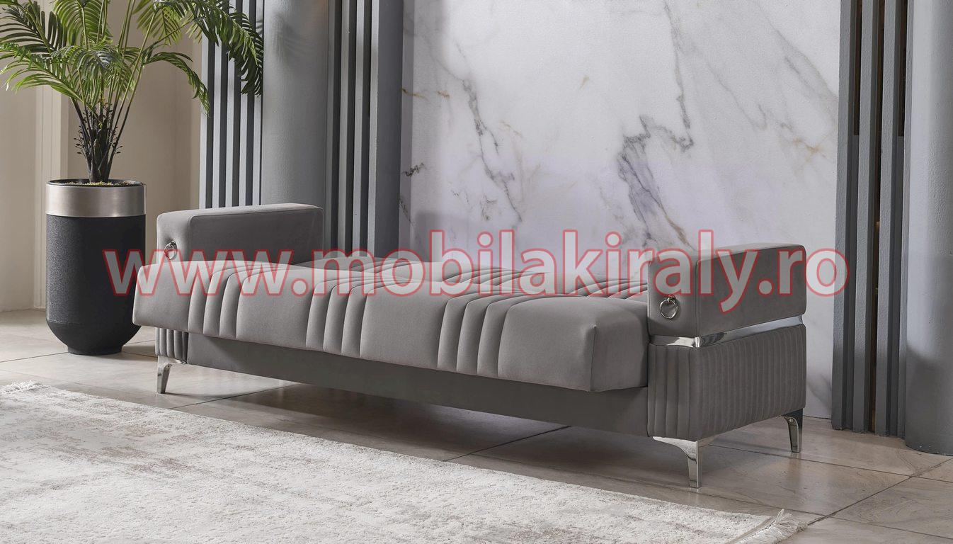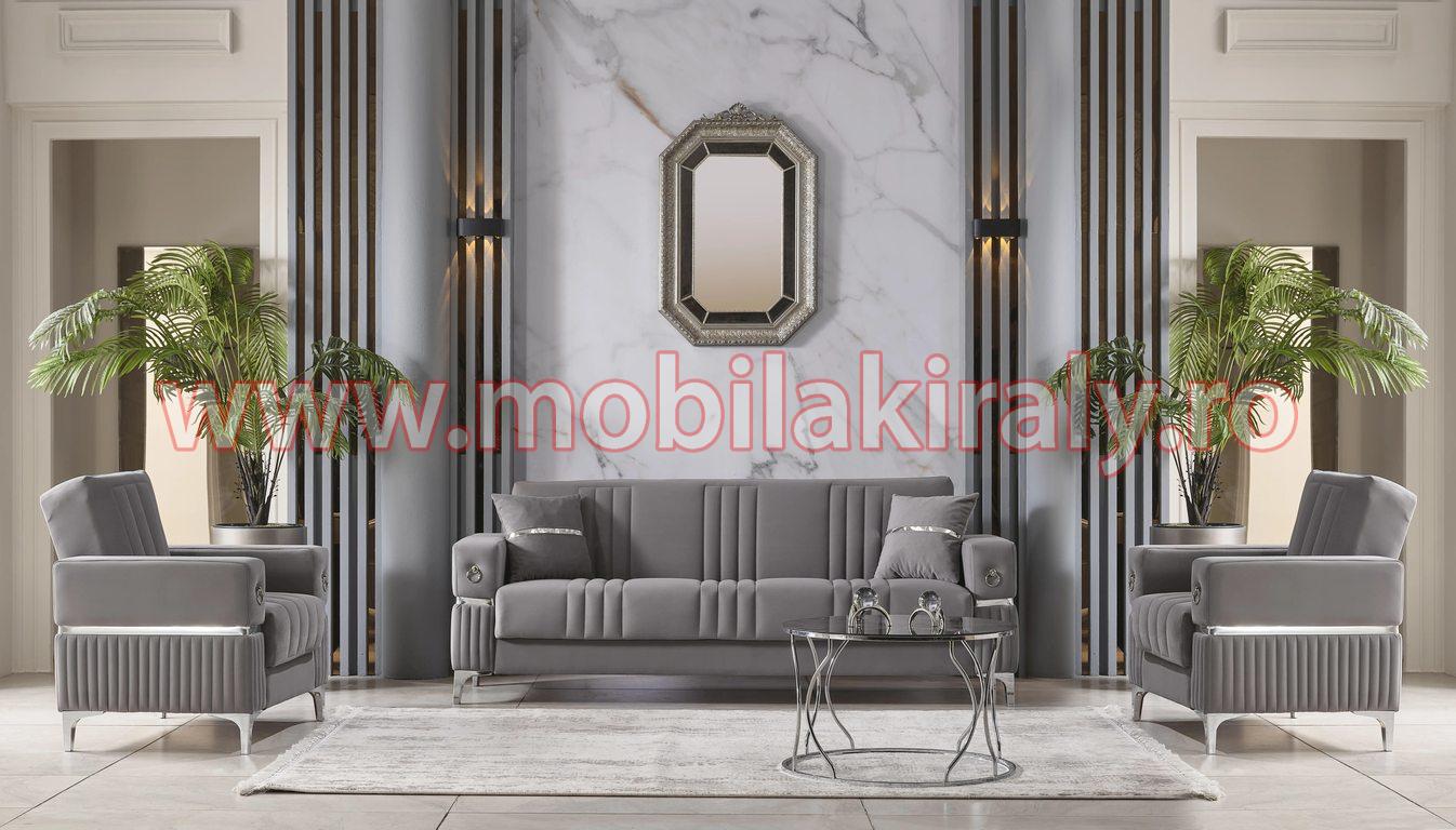 Transformă-ți camera de zi într-un sanctuar al rafinamentului, cu setul de canapele extensibile și fotolii, un model de lux ce îmbină armonios stilul contemporan cu detaliile clasice. Această nuanță elegantă de gri, accentuată de inserții argintii, emană o atmosferă sofisticată, aducând un plus de personalitate și stil în orice interior.