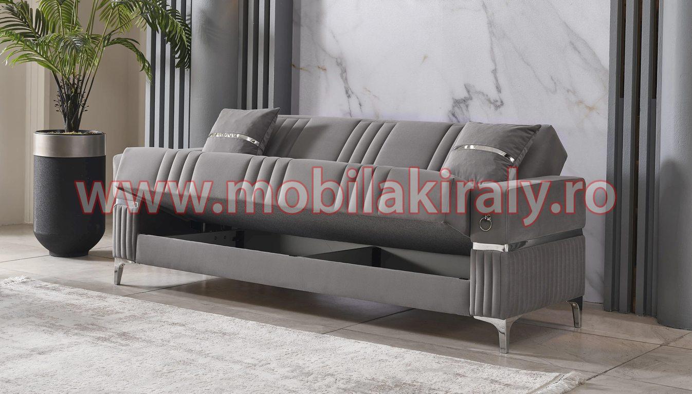 Canapeaua extensibilă cu trei locuri, dotată cu un sistem ingenios de extensie, îți permite să transformi rapid un spațiu de relaxare într-un pat dublu generos, ideal pentru oaspeți. Cu linii curbate și saltele de calitate superioară, fiecare moment petrecut pe canapea devine o experiență inegalabilă de confort și relaxare. Lada de depozitare integrată îți oferă posibilitatea de a păstra lenjeria și pernele la îndemână, economisind astfel spațiu în dulapuri.