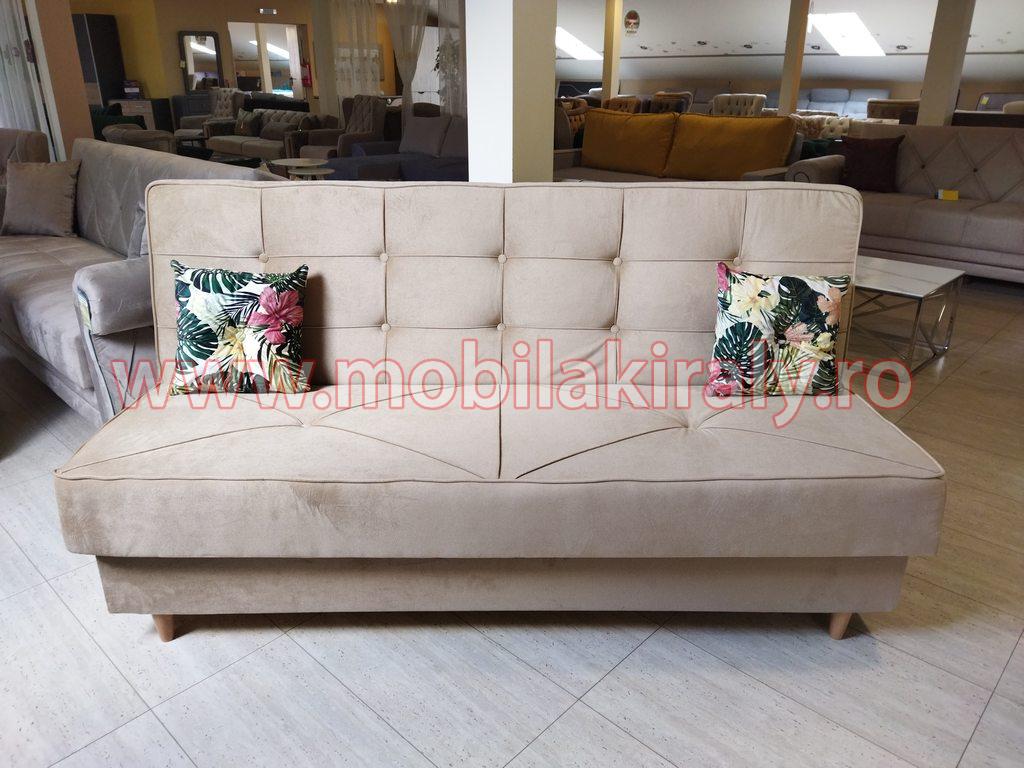 Canapea extensibila realizata pe structura de lemn masiv, cu elemente de placi aglomerate, plasa de arcuri relaxa, poliuretan.