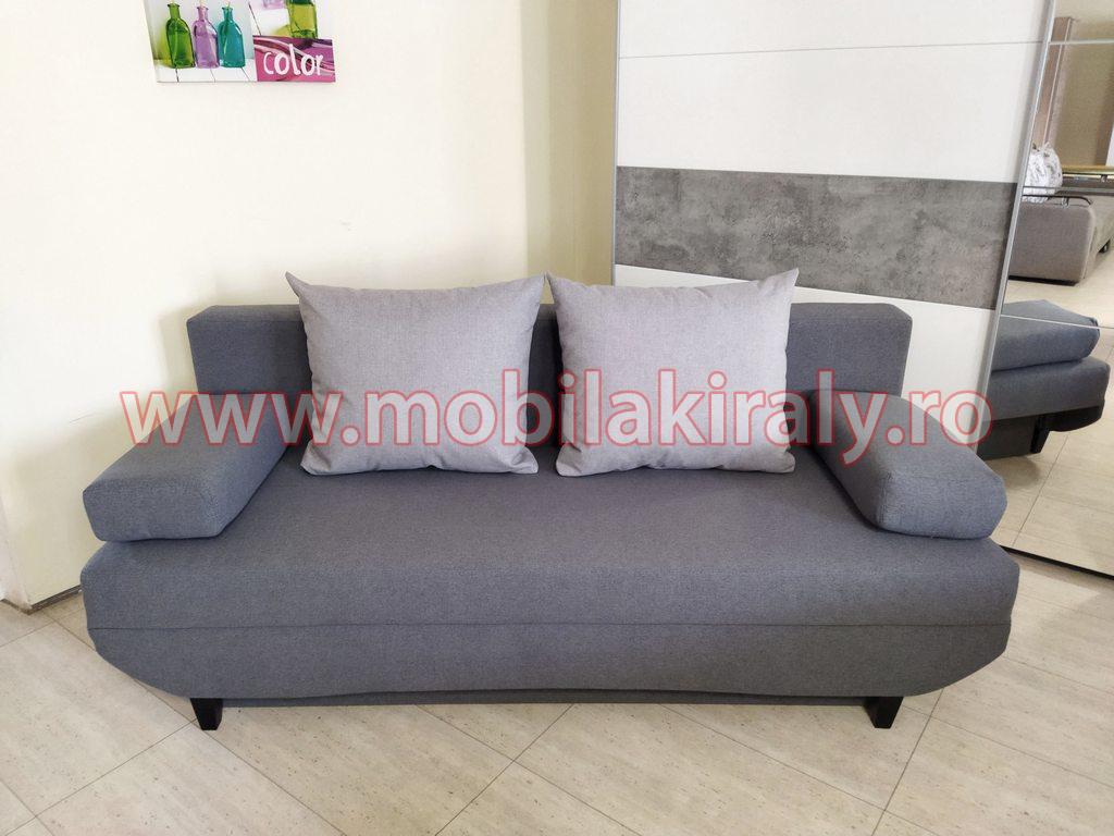 Canapea extensibila realizata pe structura de lemn masiv, cu elemente de placi aglomerate, plasa de arcuri relaxa, poliuretan.