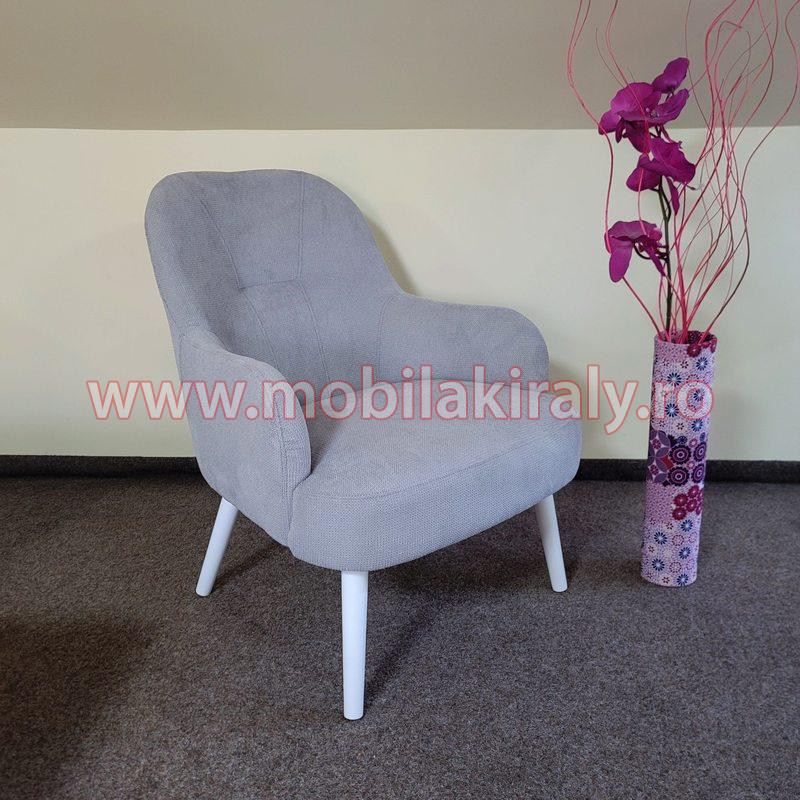 Picioarele fotoliului sunt demontabile din lemn masiv de fag prinse pe un cadru metalic.