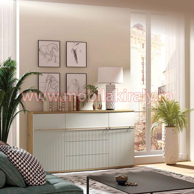 Comoda pentru dormitor cu un design special. Dispune de trei sertare mari în partea centrală și două uși laterale, oferind un spațiu de stocare generos și acces facil la obiectele din interior.