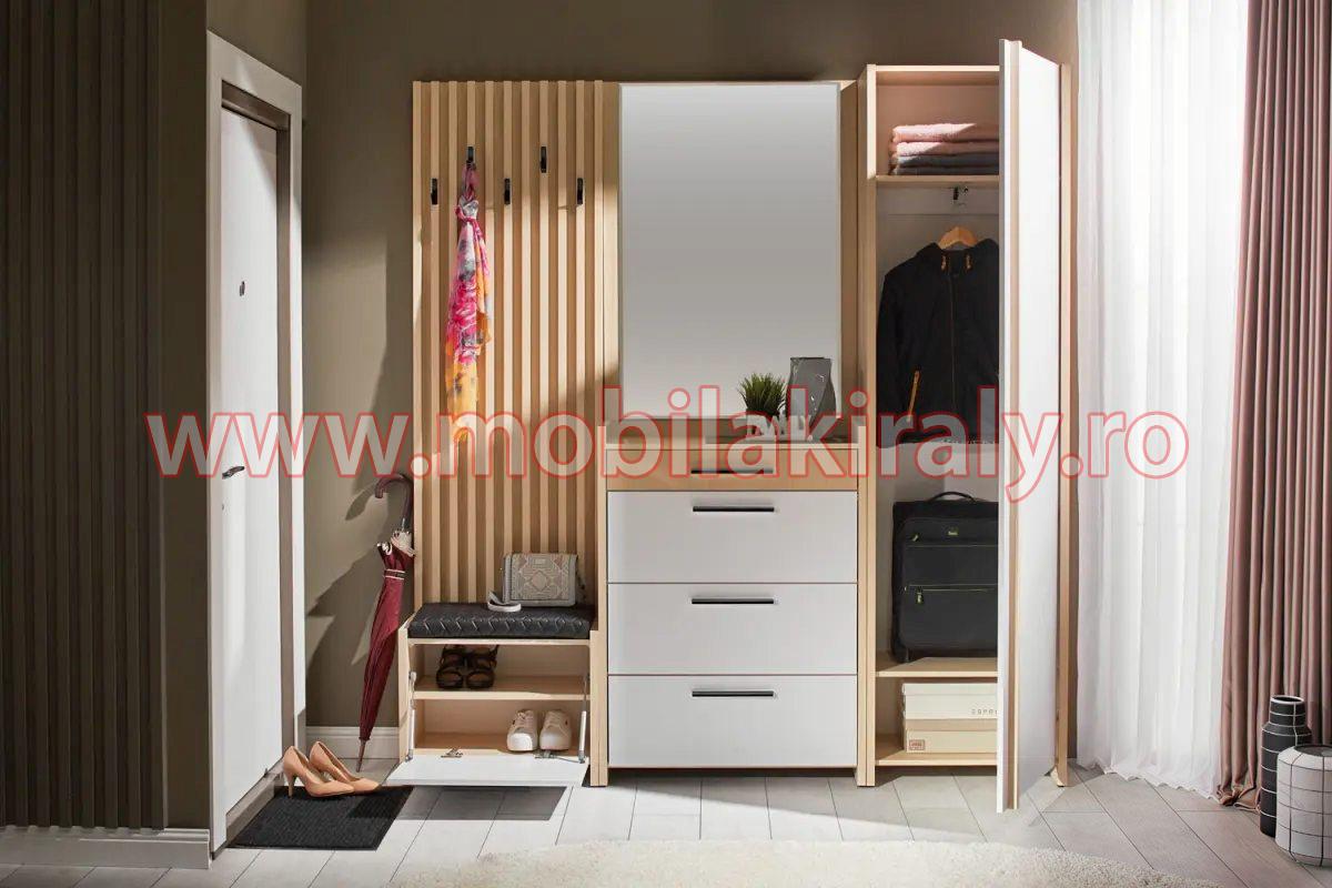 – Oglinda de 80 cm lățime care se fixează de perete și un pantofar cu 3 sertare speciale pentru pantofi/încălțăminte + un minisertar pentru chei sau alte obiecte utile în zona de hol