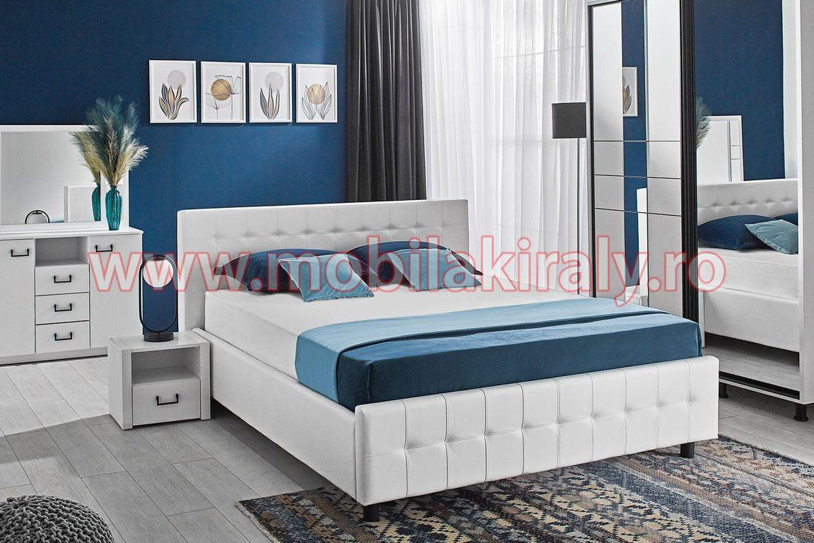Dormitor elegant și practic, compus din pat tapitat, dulap mare fără oglindă, comoda fără oglinda, două noptiere cu design șic.
