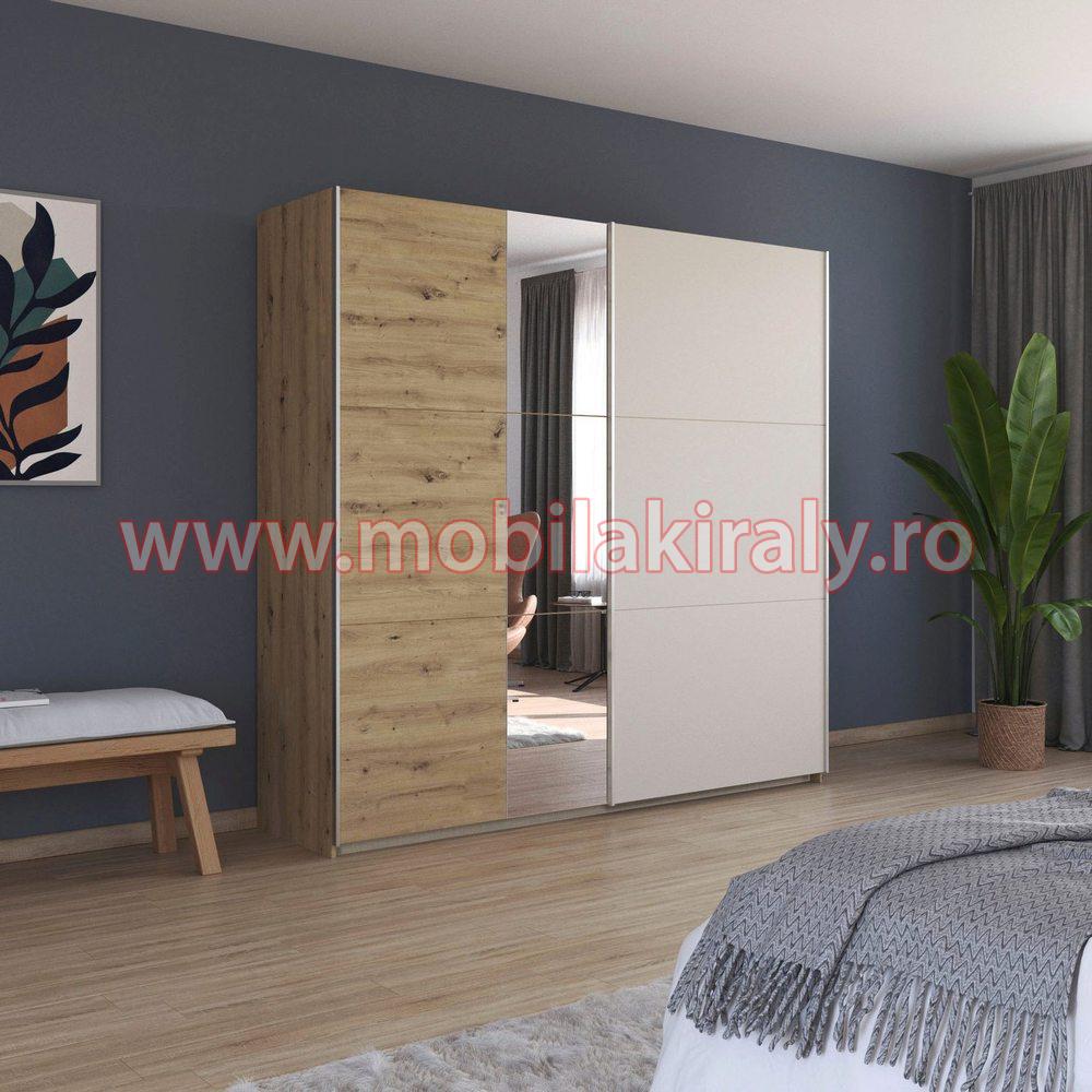 Dulapul cu 2 uși glisante. Una dintre ușile culisante este acoperită cu o oglindă mare, iar a doua cu rame decorative speciale și oglinzi mai mici. Dulapul este fixat pe picioare metalice de 100 mm.