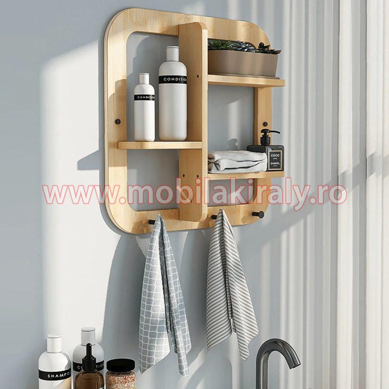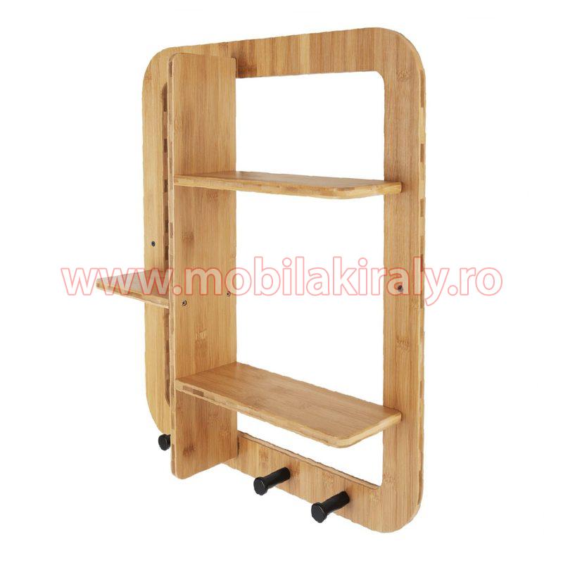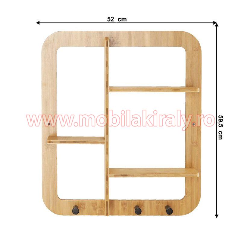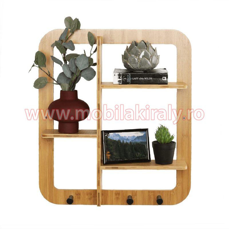 Raftul de design din bambus vă va atrage cu siguranță atenția. Datorită lui, peretele dvs. va arăta mai confortabil și va crea o atmosferă magică în casa dvs. Are o formă dreptunghiulară rotunjită și trei rafturi combinate cu trei cârlige.
