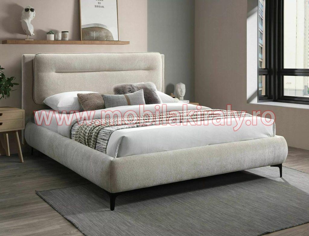 Pat modern cu spatar moale capitonat cu stofă plușată plăcută la atingere.