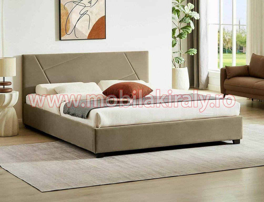 Este un pat tapitat cu stofa catifelata de calitate. Baza include somiera rabatabila, astfel incat se poate accesa foarte usor lada de depozitare.