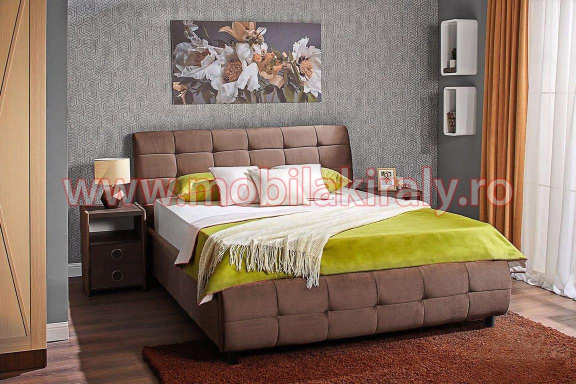Este un pat tapițat cu stofa bej-boucle de cea mai bună calitate, conține o somieră rabatabilă din metal cu lamele din lemn stratificat iar lada de depozitare are capsule de aerisire. Este foarte practic datorită lăzii de depozitare pe toata suprafața patului si confortabil datorită tăbliei patului.